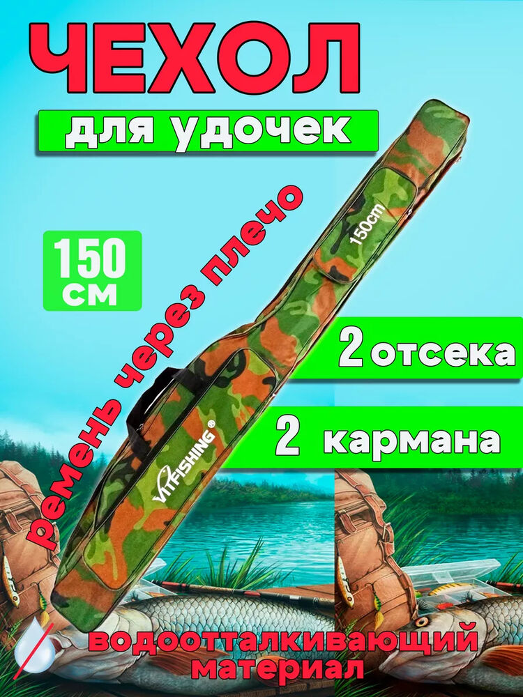 Этот водонепроницаемый чехол для удочек с рыболовной катушкой — идеальное решение для защиты ваших удочек от непогоды. Изготовленный из прочного материала оксфорд, этот чехол обладает водоотталкивающими свойствами и надежно защищает ваши удочки от дождя, снега и других погодных условий. Он имеет две секции и два кармана для дополнительного хранения, а также застежку - молнию для надежной фиксации. Чехол выпускается в двух размерах — 130 см и 150 см — так что вы сможете подобрать идеальный вариант для спиннинговых, фидерных или любых других удилищ. С этим чехлом для удилищ вы можете быть уверены, что ваши рыболовные снасти останутся сухими и безопасными, что бы ни выкинула на вас мать-природа. Если удочки с катушками, то в каждое отделение поместится по 3-4 штуки. Если просто хлысты без оснастки то по 6-7 комплектов в каждое отделение. Чехол для рыбалки имеет два кармана, в карман побольше можно разместить колышки-подставки под удочки. У чехла для удочек есть маленький карман, можно разместить, монтаж наборы крючков леска для удочки и тд. чехол для удочек с катушкой фидерная удочка спиннинг с катушкой чехол кармашек водонепроницаемый чехол ловля спиннинг для крючков под фидерное